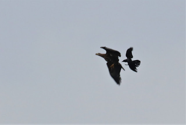 Kort efter kommer min første fiskeørn i år, ind over os fra vest. Glider lavt ind over landskabet og lige over to ornitologer der ivrigt studerer tornskaden i teleskop, men desværre nok ikke fanger fiskeørnen lige over dem. En næsten hvid musvåge slår på noget i græsset mens to gråkrager mobber.