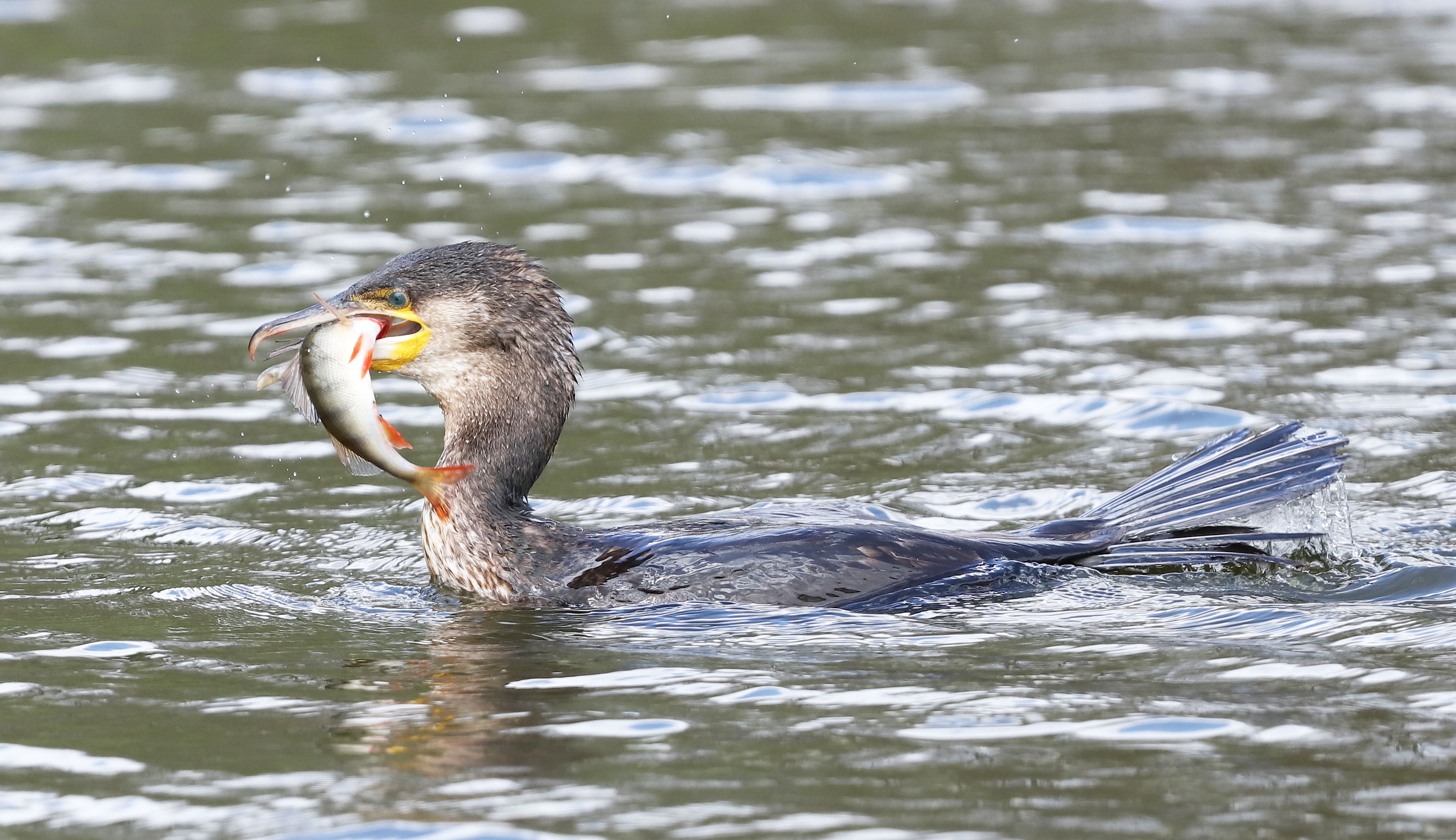 Indenfor et min. dykker den efter fisk to gange og fanger begge gange en stor Aborre, som sluges omgående, efter at fisken er blevet vendt med hovedet ind mod fuglens svælg.